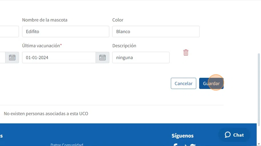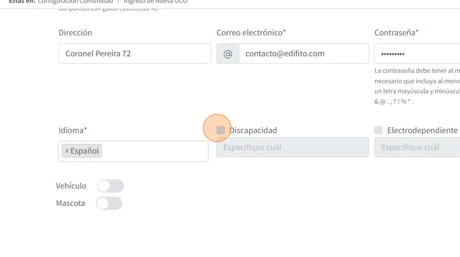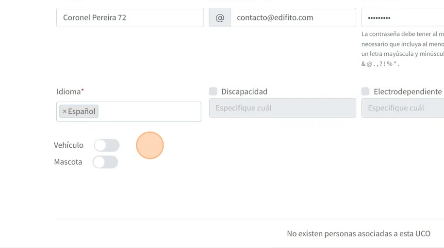 6. Para registrar datos del vehículo y/o mascota que tenga el usuario, puede habilitar los campos respectivos y registrar los datos de cada uno.