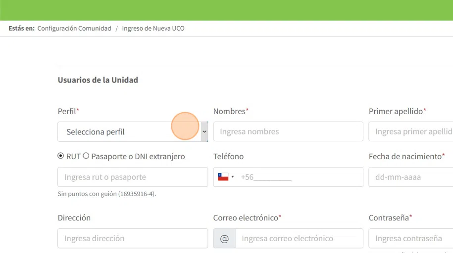 4. Se despliegan una lista de campos a completar con todos los datos del nuevo usuario de la Unidad de Copropiedad, los cuales debe ir completando. Es importante mencionar que los campos con un asterisco (*) son OBLIGATORIOS.