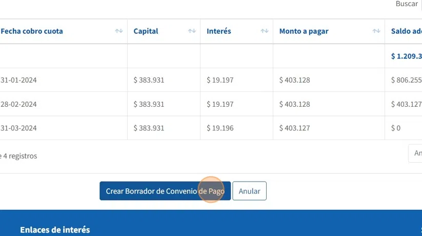 8. Para finalizar, click en "Crear Borrador de Convenio de Pago", luego click en "Aceptar"