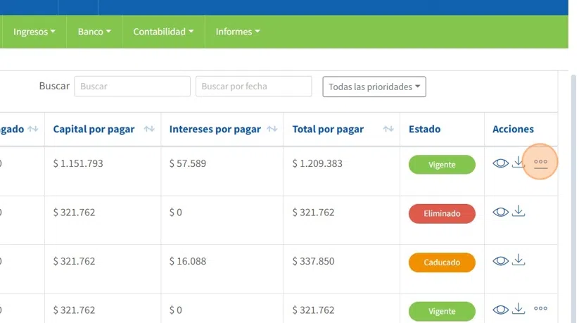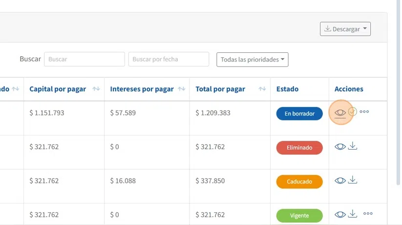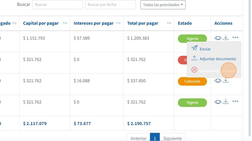 9. En el listado de convenios, se despliegan los estados de cada uno: