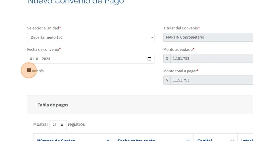 6. Si desea incluir el porcentaje de interés en el convenio, maque el siguiente campo y complete con el valor porcentual del interés.