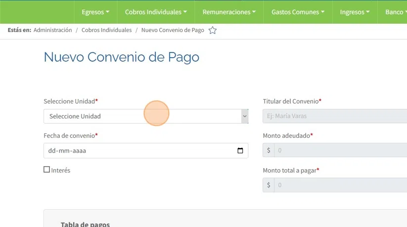 1. Ruta: Administración > Cobros Individuales > Convenios de Pago